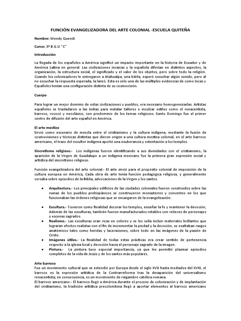 La religión impuesto por los españoles durante la colonización impregnaba todos los ámbitos de la vida.. 2 3 con gran alegría y satisfacción presentamos al público universitario, y ampliamente a toda la comunidad, la segunda exposición de arte colonial de la colección joaquín gandarillas infante, que tuvimos el agrado de acoger en comodato el año recién pasado. 6 obras del barroco en américa. Tras el concilio la iglesia católica vive una situación de gozo, exuberancia, de grandiosidad, variedad, luminosidad. El arte barroco "invistió la realidad con una formidable carga de imaginación y buscó transformar el mundo visible en fiesta, es decir, intentó poner la actividad productiva al servicio del goce" (duvignaud). El arte americano presenta características originales a causa de las influencias de los modelos peninsulares y del arte precolombino. Antítesis del desprendimiento de la sobriedad puritana, el barroco americano es también la expresión de una cultura religiosa opuesta a la del protestantismo. En américa, el barroco se desarrolló desde mediados del siglo xvii hasta los comienzos del siglo xix. Las obras artísticas realizadas en las colonias americanas presentan algunas características propias. El barroco en américa se ve influenciado por los escritores europeos durante el tiempo de la colonia. 01.12.2015 · en 1734 hizo una imagen de la inmaculada para la iglesia de san francisco, que gozó del favor popular, haciéndose de ella innumerables copias e imitaciones que se encuentran en ecuador y colombia.. La religión impuesto por los españoles durante la colonización impregnaba todos los ámbitos de la vida.